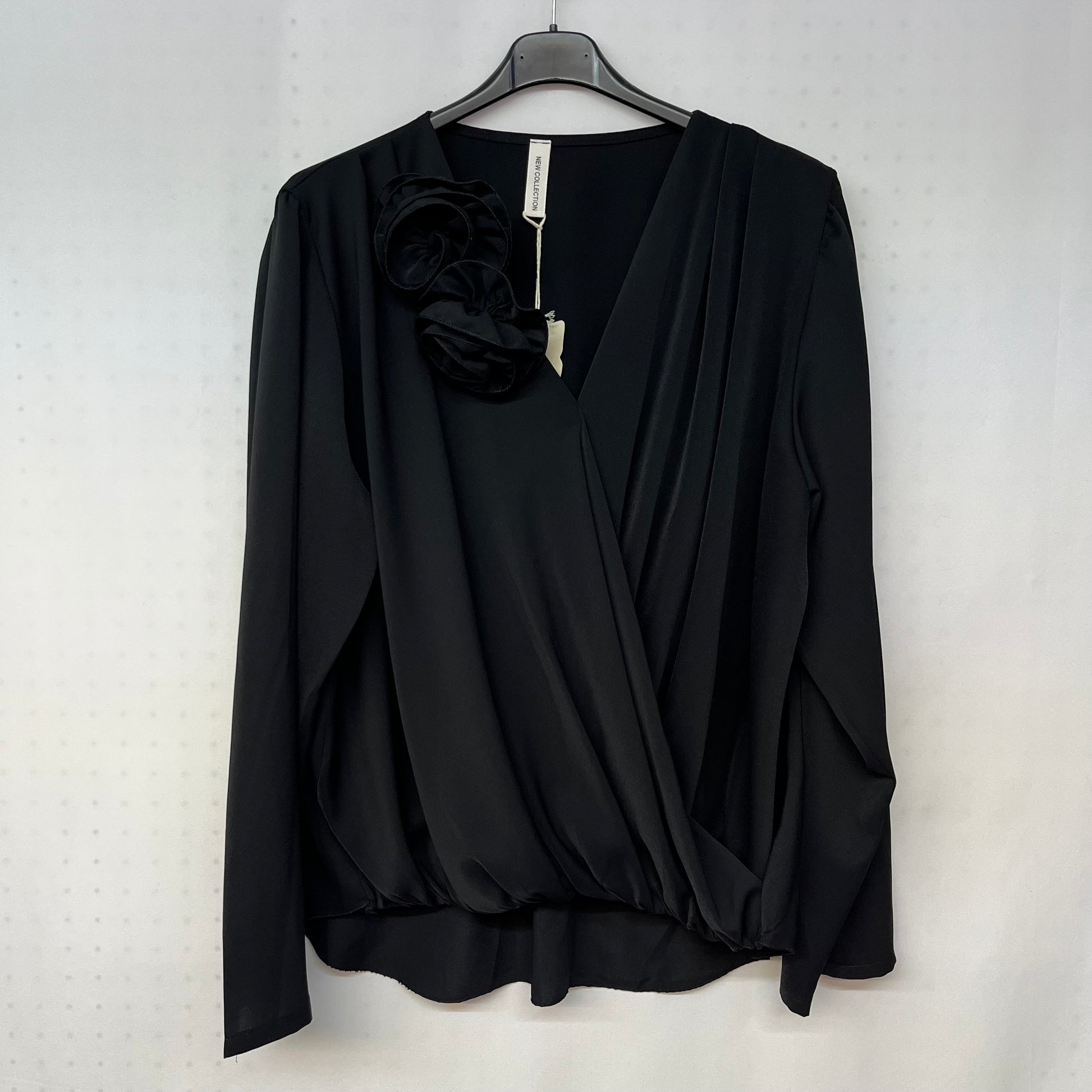 La Blusa Romantic presenta un design distintivo con scollo a V e due rose applicate, realizzate nella stessa stoffa. La lunghezza asimmetrica, con un retro leggermente più lungo, offre un tocco di eleganza. Questa blusa è ideale per arricchire il guardaroba con un elemento sofisticato e versatile.