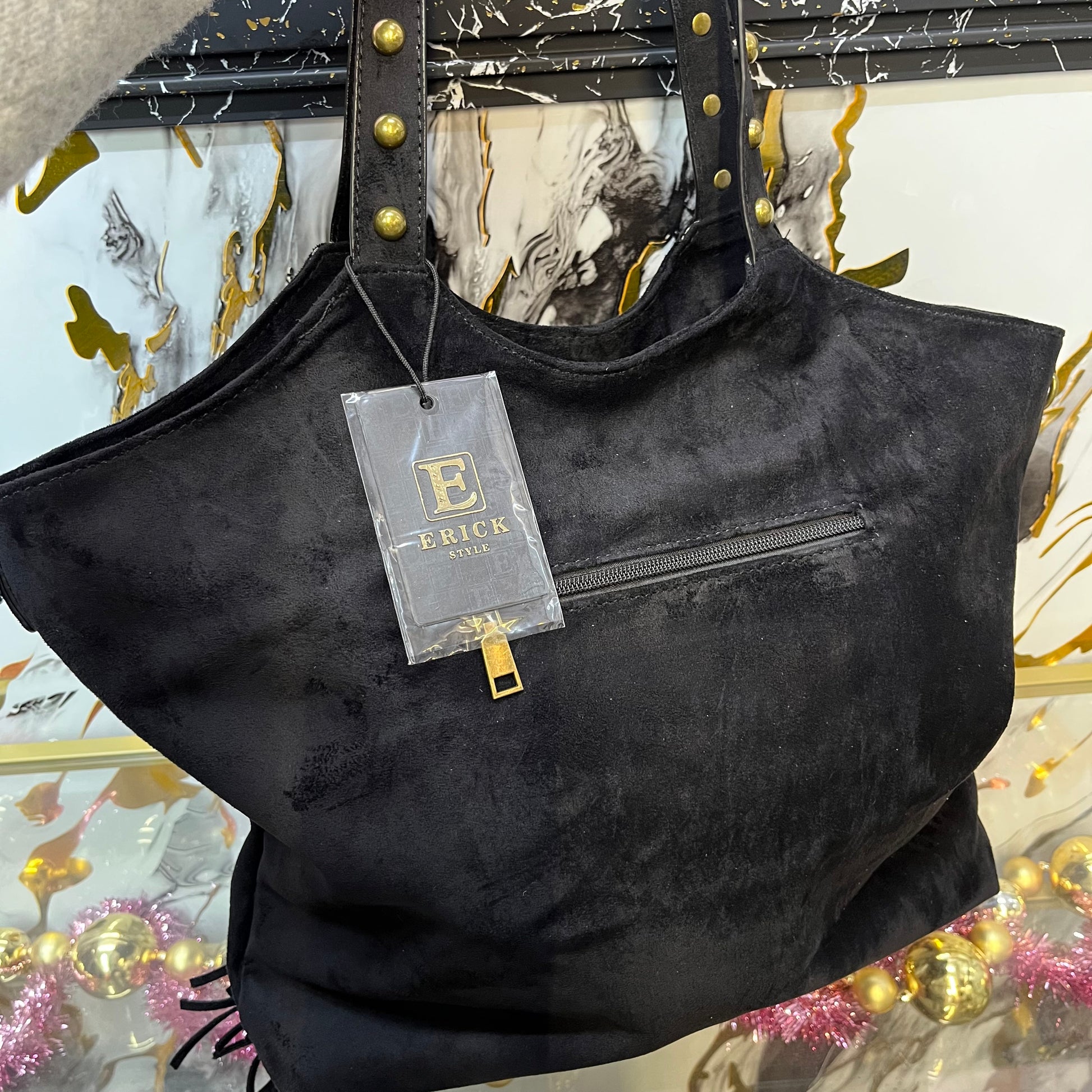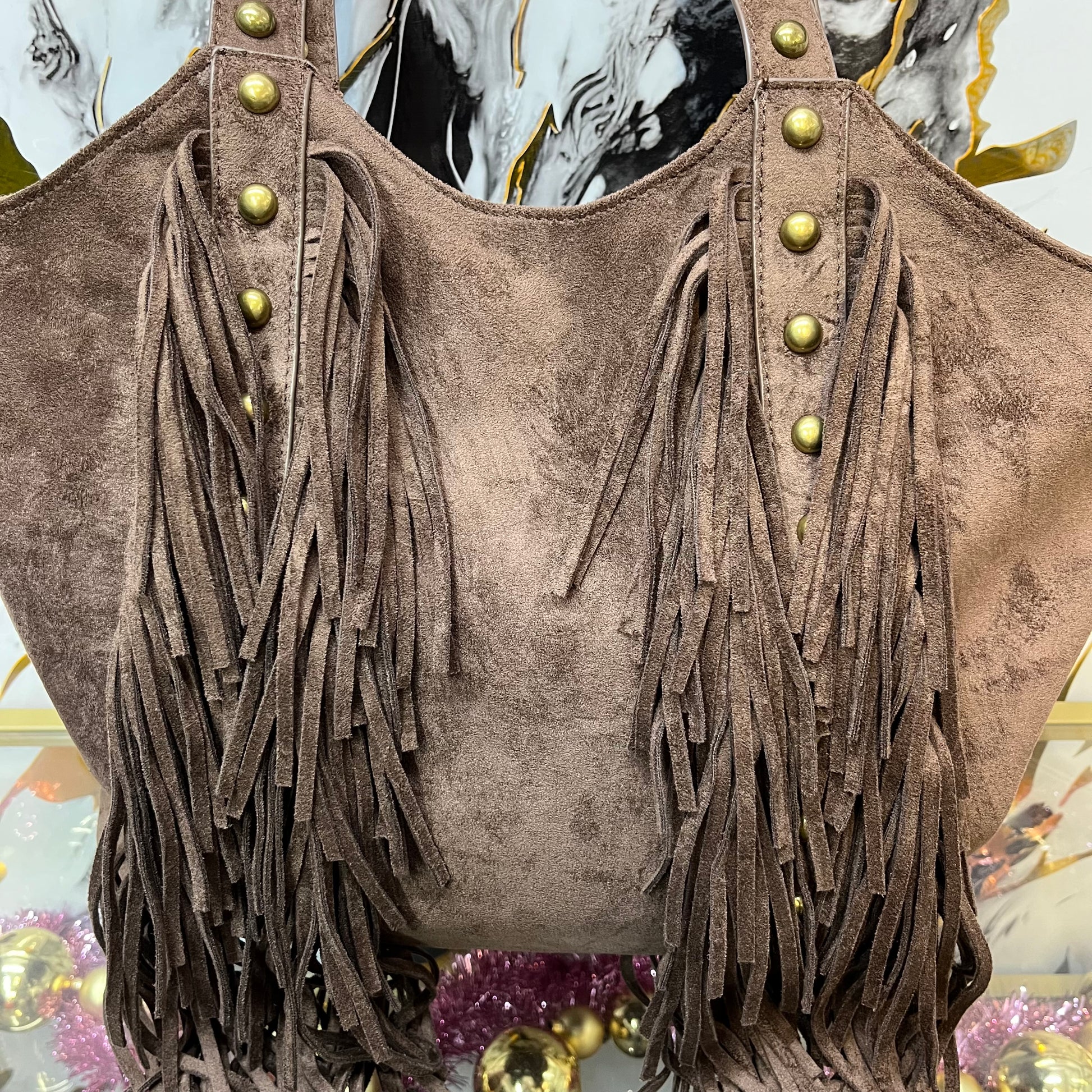 La Kaia è una borsa a spalla di eco pelle effetto scamosciato, che unisce lo stile e l'eleganza delle borchie dorate alle frange per un look unico. Con una capacità molto capiente, è perfetta per ogni occasione. Confortevole da indossare grazie alla sua tracolla.