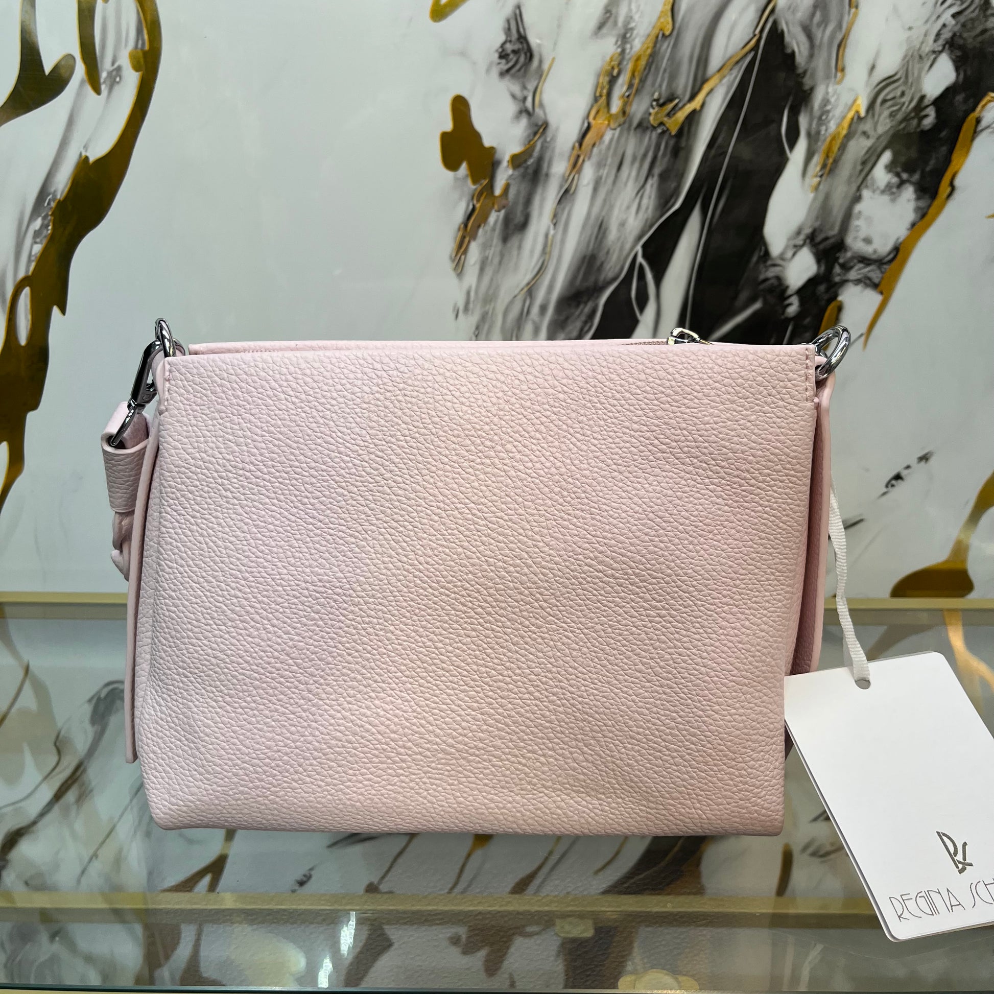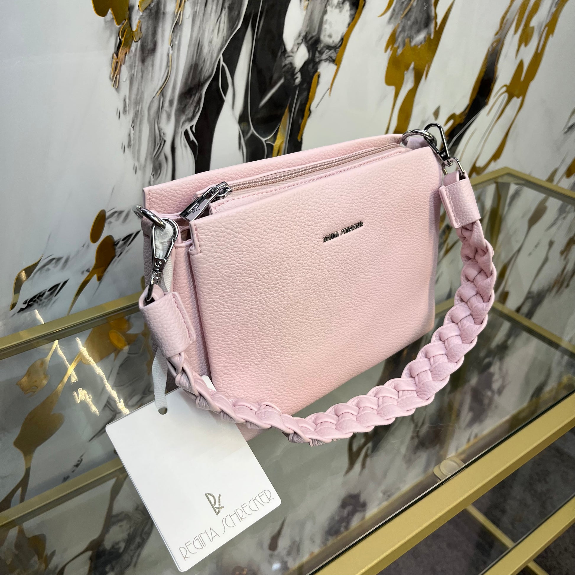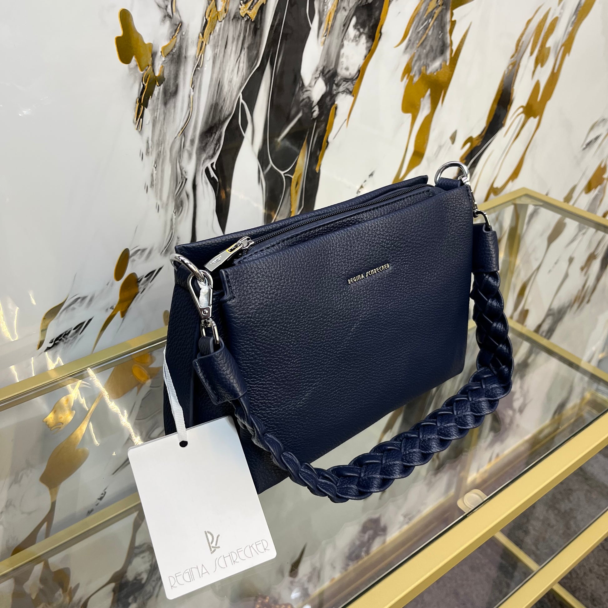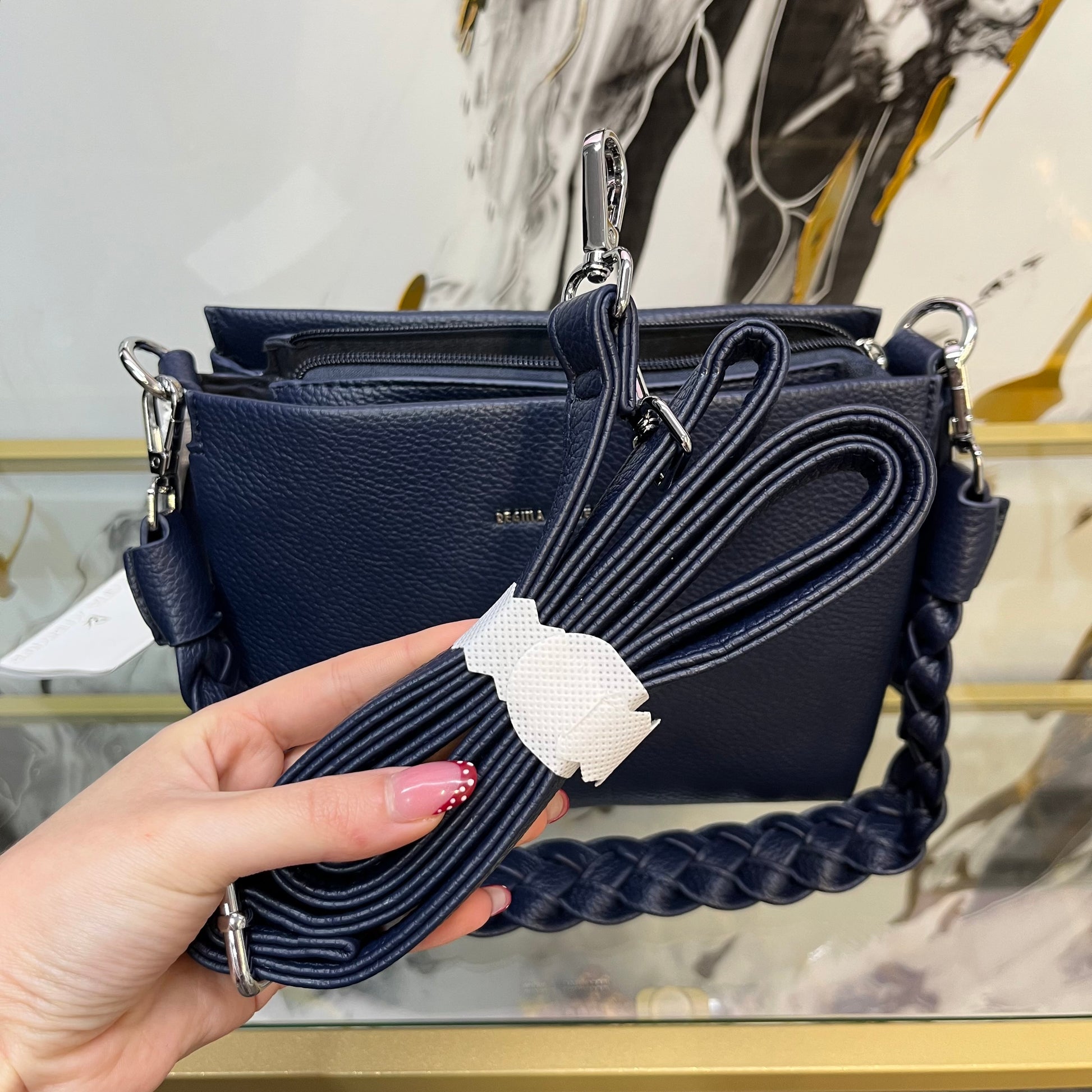 La Borsetta Regina è un accessorio in ecopelle, progettato con un elegante manico intrecciato. Dispone di tre scomparti, uno dei quali è dotato di zip per una maggiore sicurezza, mentre gli altri sono chiusi con clip magnetica. Versatile, può essere indossata a spalla o a tracolla, offrendo un'ampia capacità di contenimento.