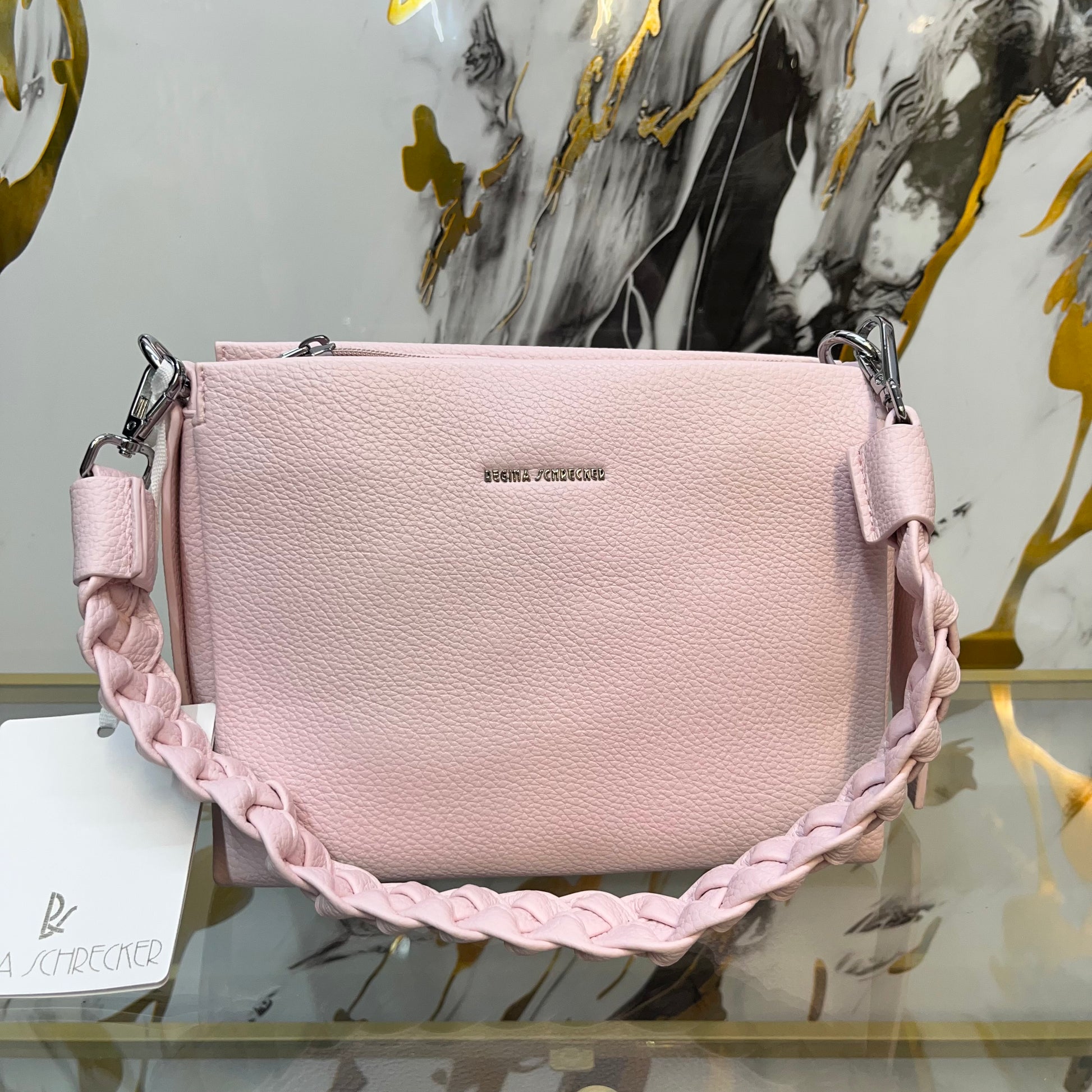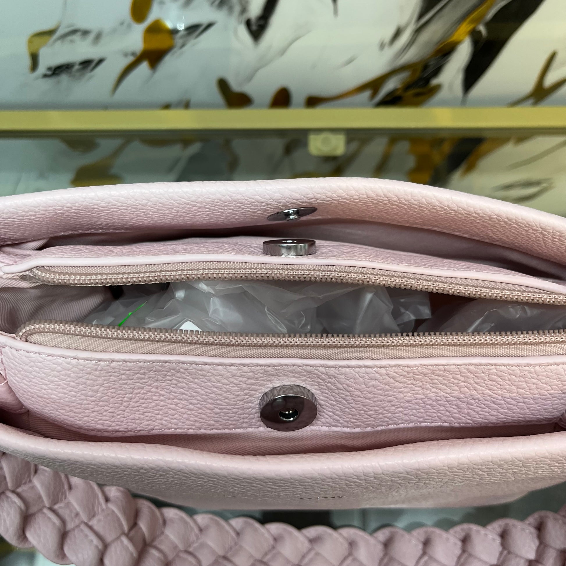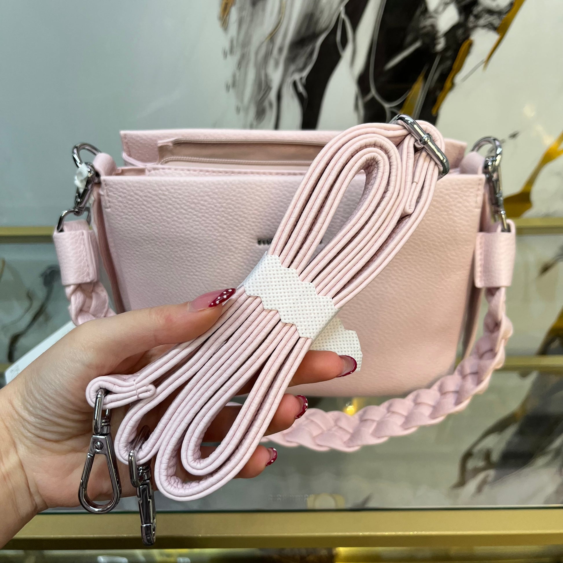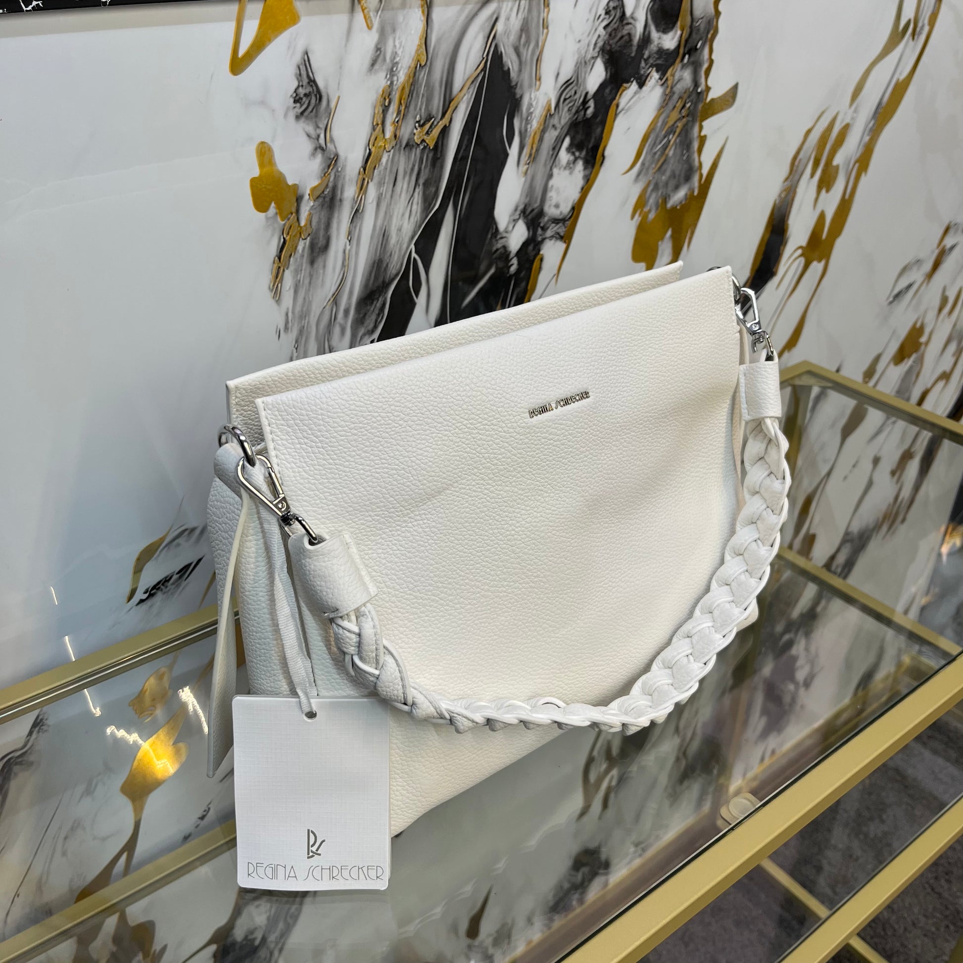 La Borsetta Regina è un accessorio in ecopelle, progettato con un elegante manico intrecciato. Dispone di tre scomparti, uno dei quali è dotato di zip per una maggiore sicurezza, mentre gli altri sono chiusi con clip magnetica. Versatile, può essere indossata a spalla o a tracolla, offrendo un'ampia capacità di contenimento.