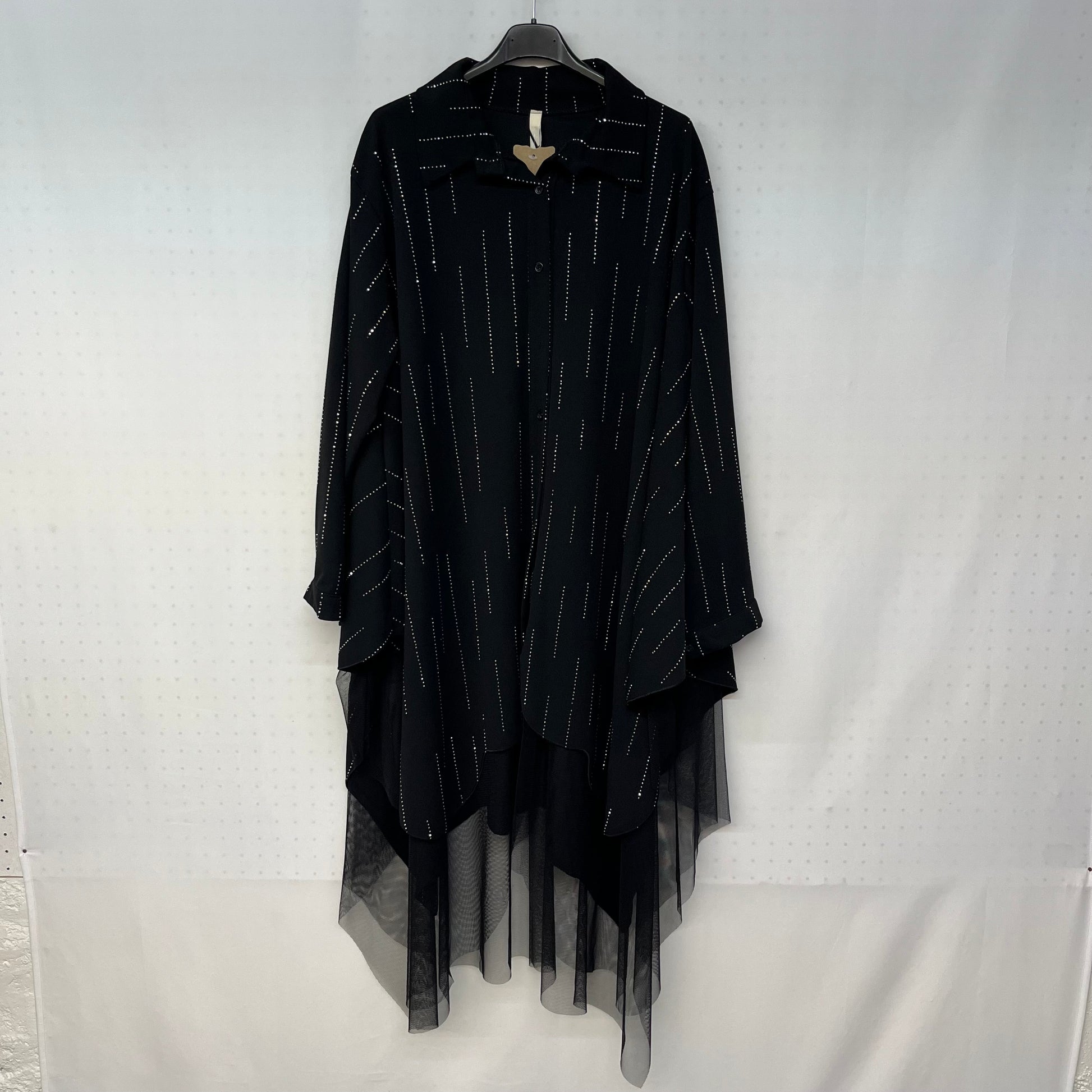 Il Camicione Vestitino Tulle è un capo versatile e unico nel suo genere. Lungo e multifunzionale, può essere indossato sia come vestitino che come top. La particolarità è rappresentata dal tulle nero che scende in modo asimmetrico, conferendo un tocco di eleganza e originalità.