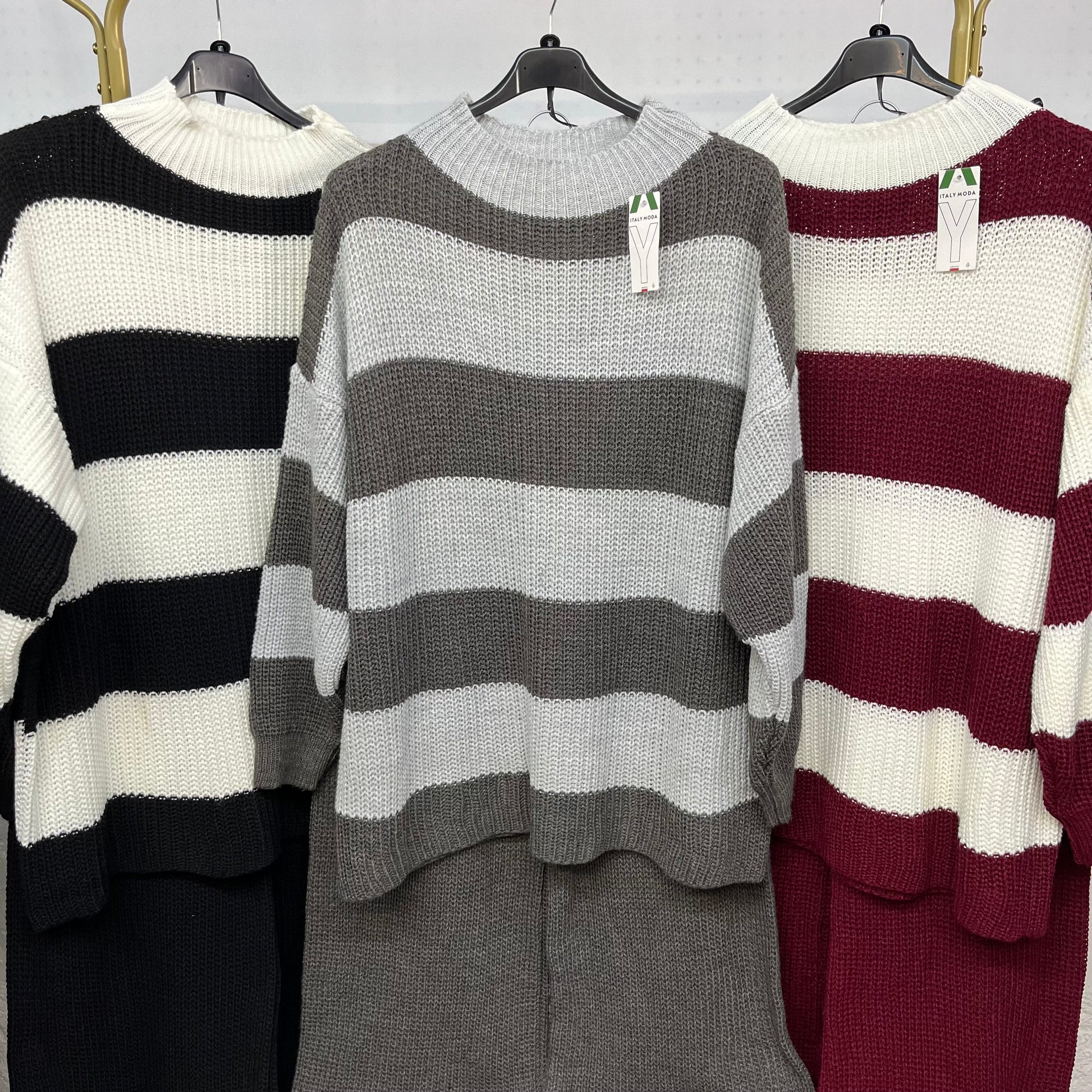 Il Coordinato Anastasia unisce l'eleganza della lanetta intrecciata con il comfort di un maglione e pantalone coordinato. Il maglione ha un collo a lupetto e presenta una delicata fantasia a righe, mentre il pantalone assicura una vestibilità perfetta. Perfetto per un look sofisticato e confortevole.