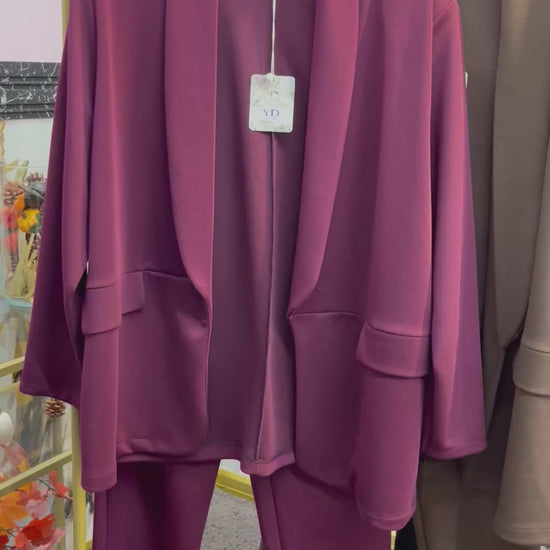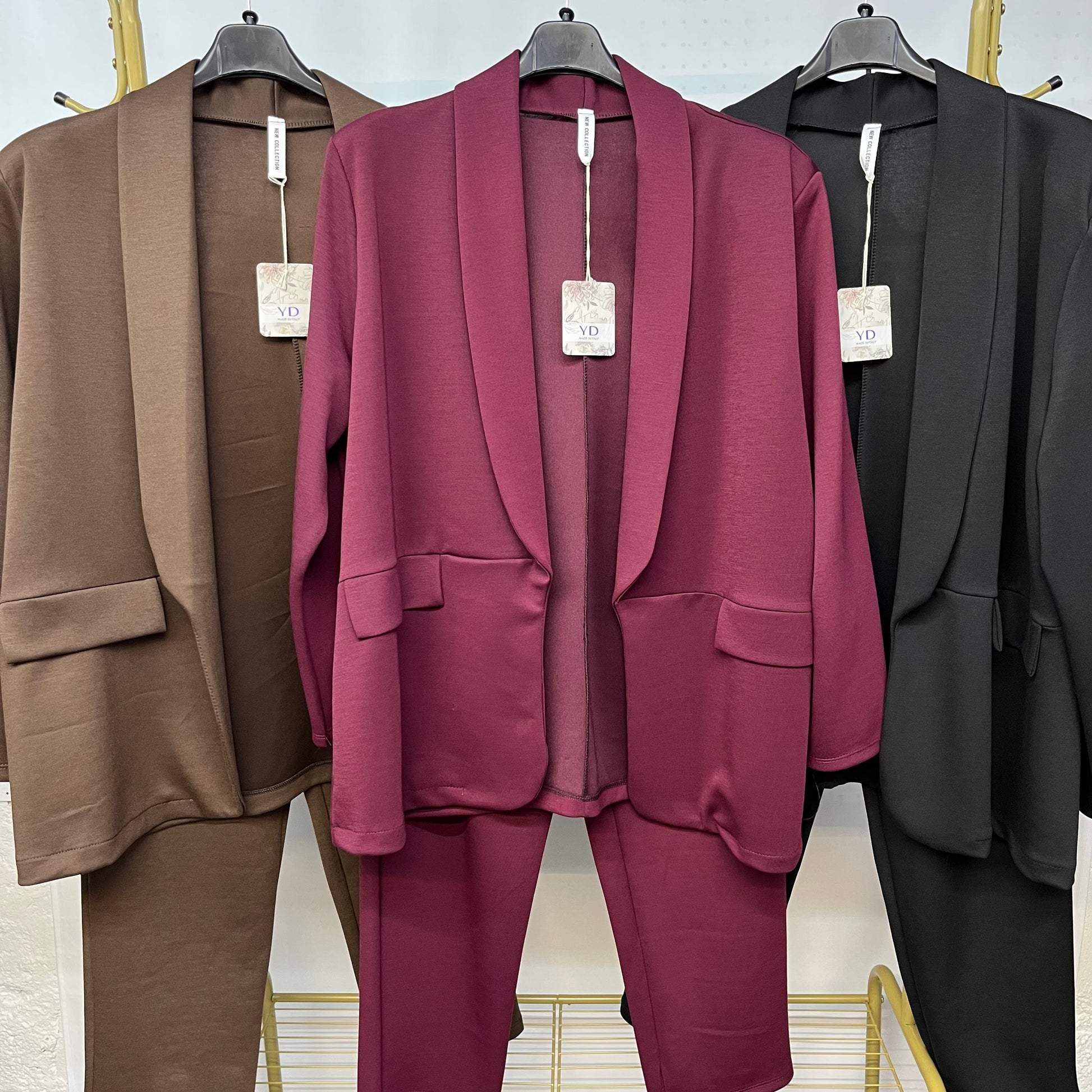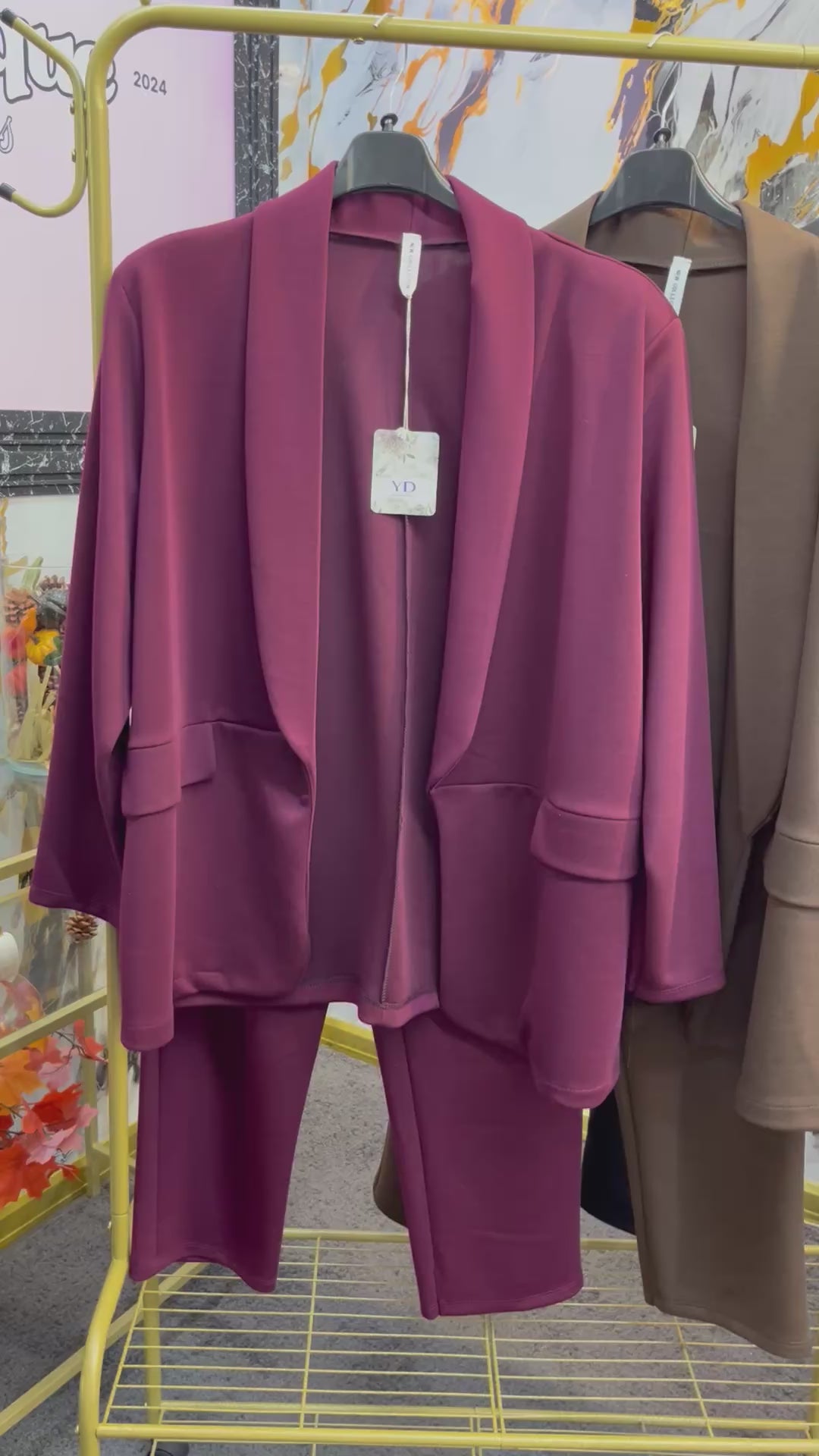 Questo coordinato è perfetto per un look elegante e confortevole. La giacca senza fodera, con spalline e senza bottoni, è perfetta per un tocco di stile informale. Il pantalone elasticizzato in vita e con tasche completano il coordinato in un tessuto morbido e stretch. Un accostamento di praticità e stile.