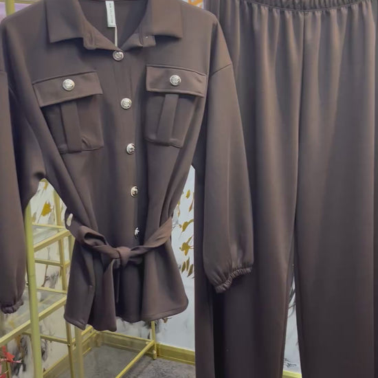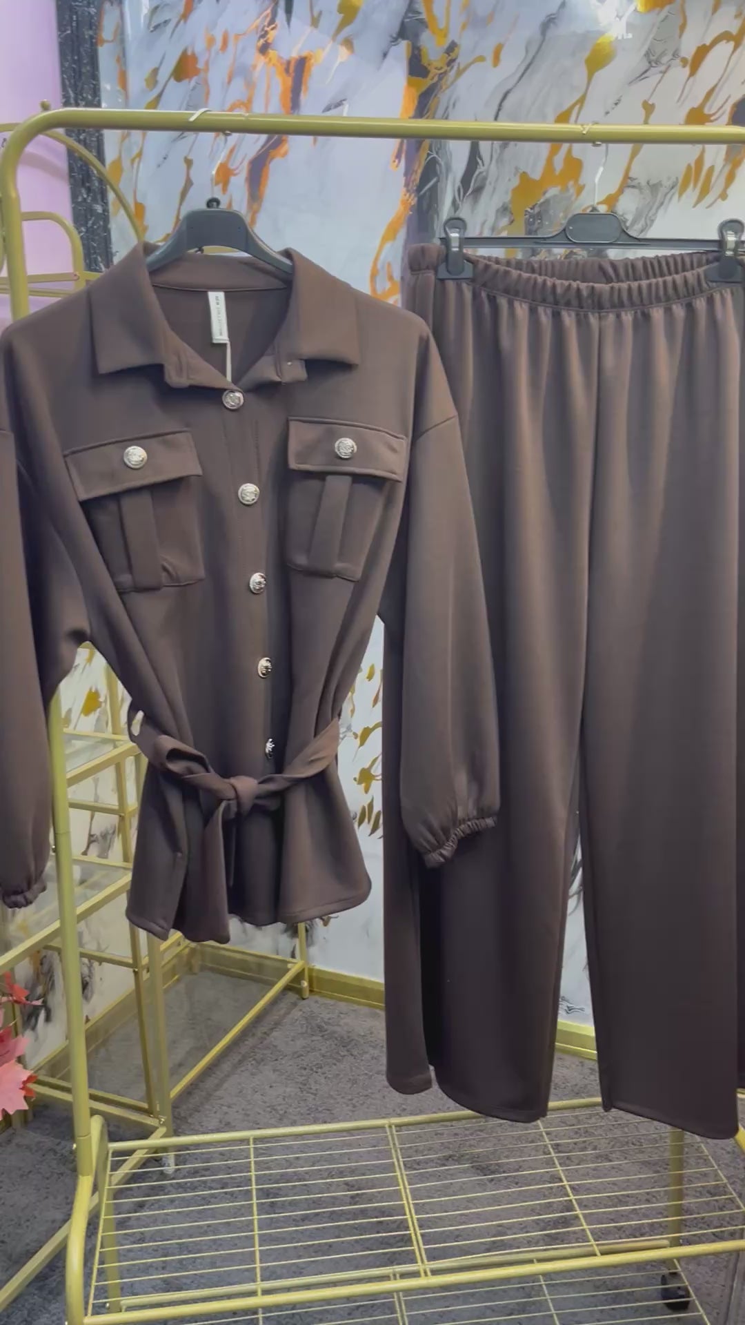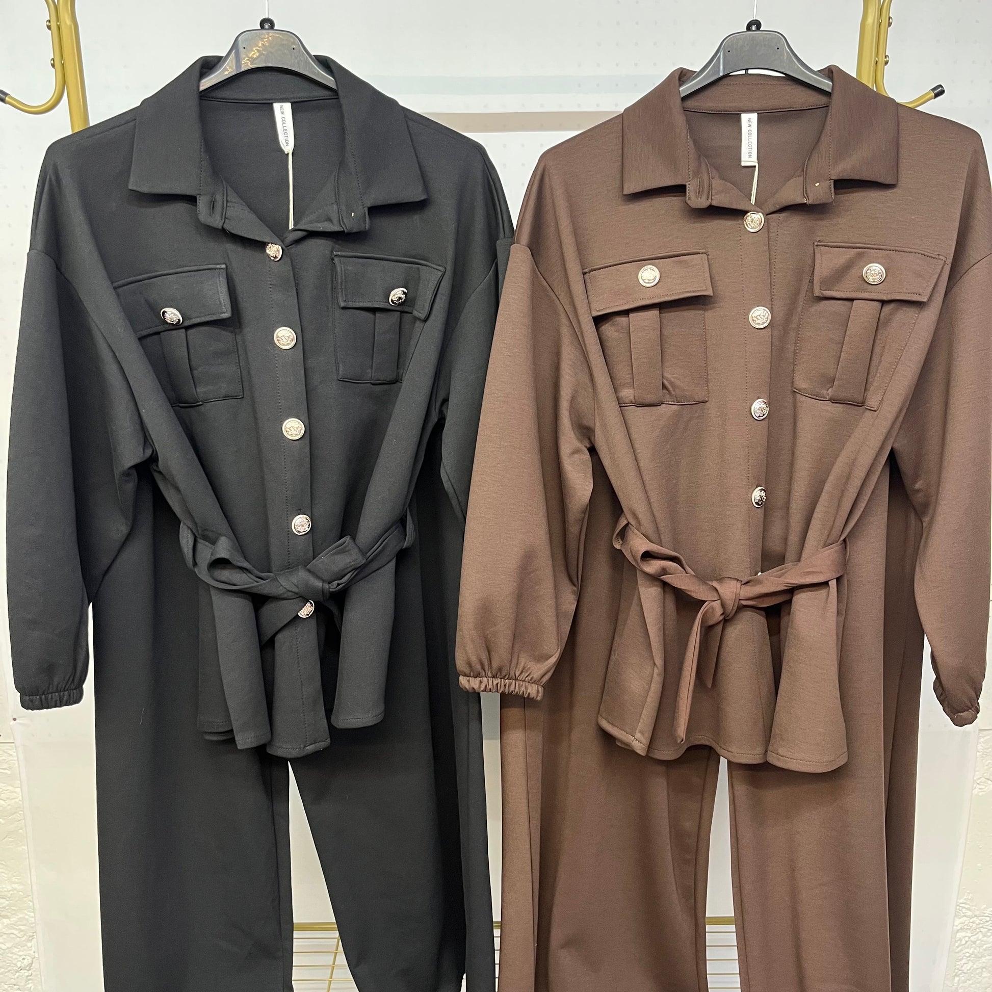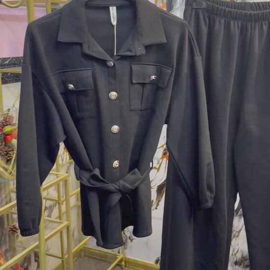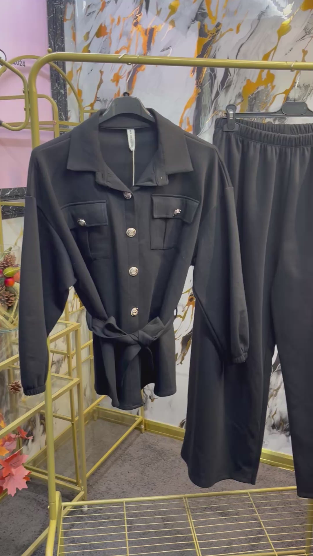 Esalte il tuo stile con il Coordinato Lucinda. La maglia stile giacchetta è dotata di colletto, taschini laterali e bottoni dorati per un tocco di eleganza. La cintura in vita accentua la silhouette mentre il pantalone elasticizzato garantisce una vestibilità comoda e perfetta. Perfetto per un look sofisticato.