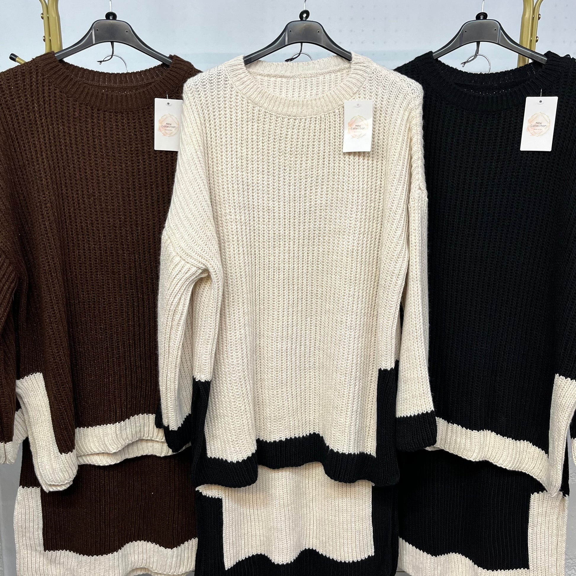 Esclusivo Coordinato Sabrina, composto da una lanetta intrecciata e abbinata maglione e gonna. Grazie al delicato cambio di colore sui bordi, dona un tocco di eleganza e raffinatezza. Indossa questo coordinato per un look sofisticato e di tendenza.