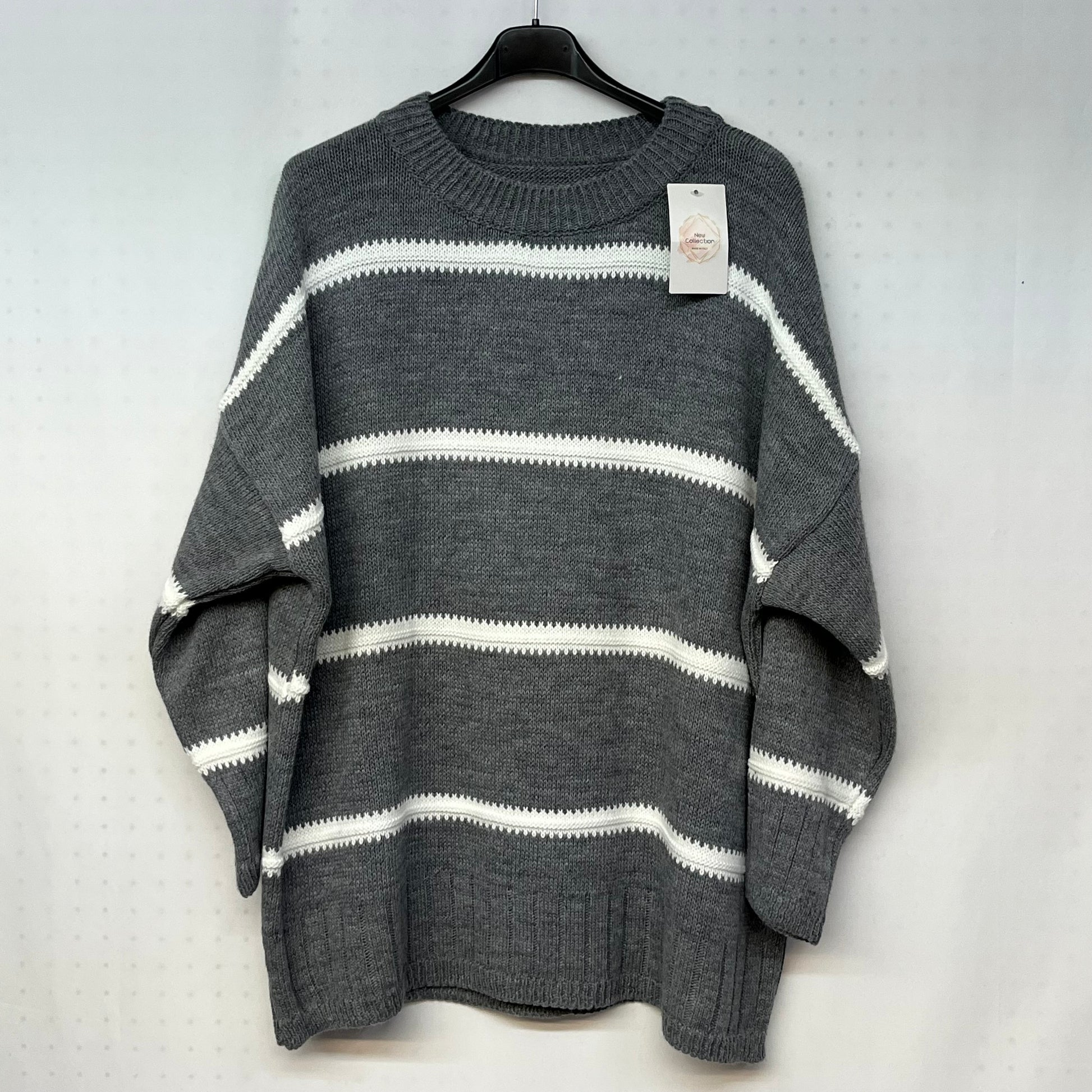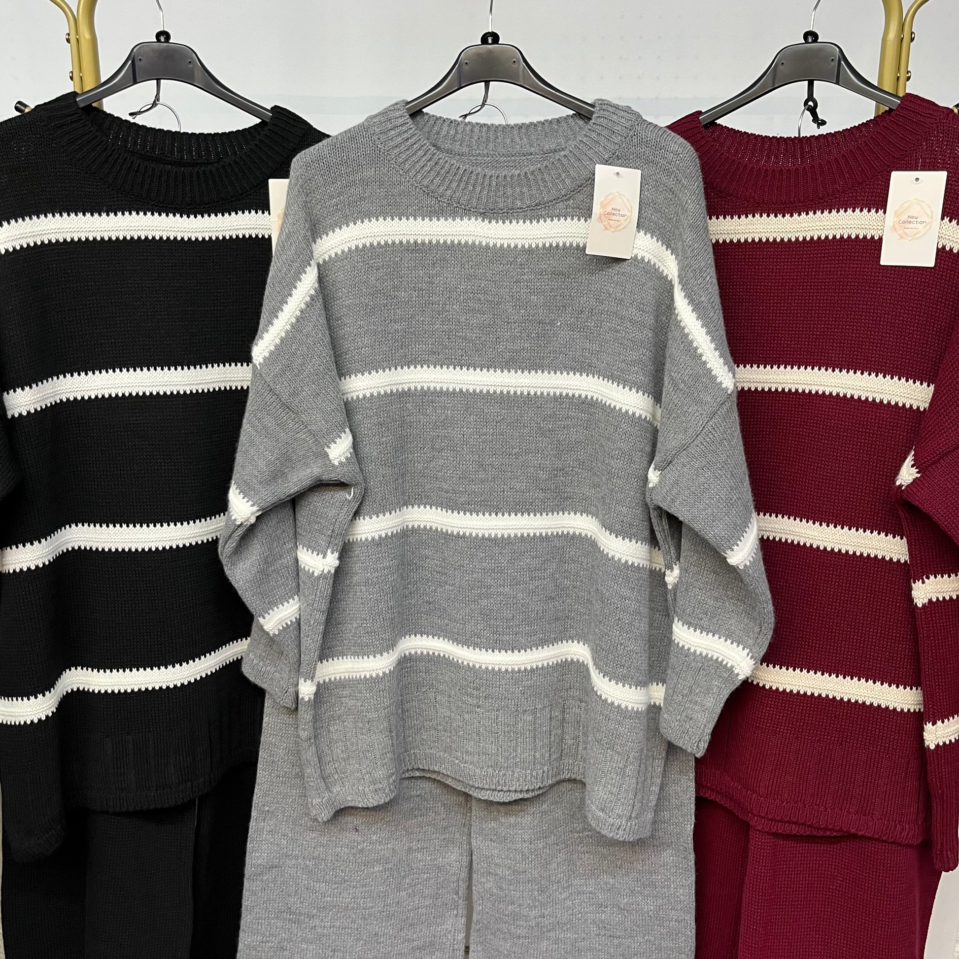 Coordinato Stella è il perfetto abbinamento di un maglioncino e un pantalone in lanetta intrecciata. Il maglioncino presenta un disegno a righe bianche orizzontali, perfetto per dare un tocco di stile e originalità al tuo look. Ideale per le giornate invernali, ti terrà al caldo e alla moda.