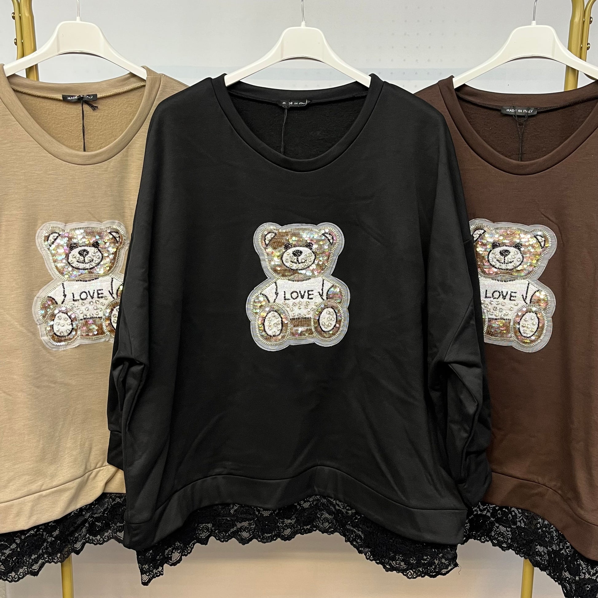 Con la Felpa Teddy Gems sarai elegante e glamour in ogni occasione. Il morbido tessuto felpato interno ti terrà caldo, mentre il centro ricamato con paillettes e gemme con disegno teddy aggiungerà un tocco di luce al tuo look. Il pizzo nero al bordo della felpa completa il tuo outfit con un tocco di raffinatezza.