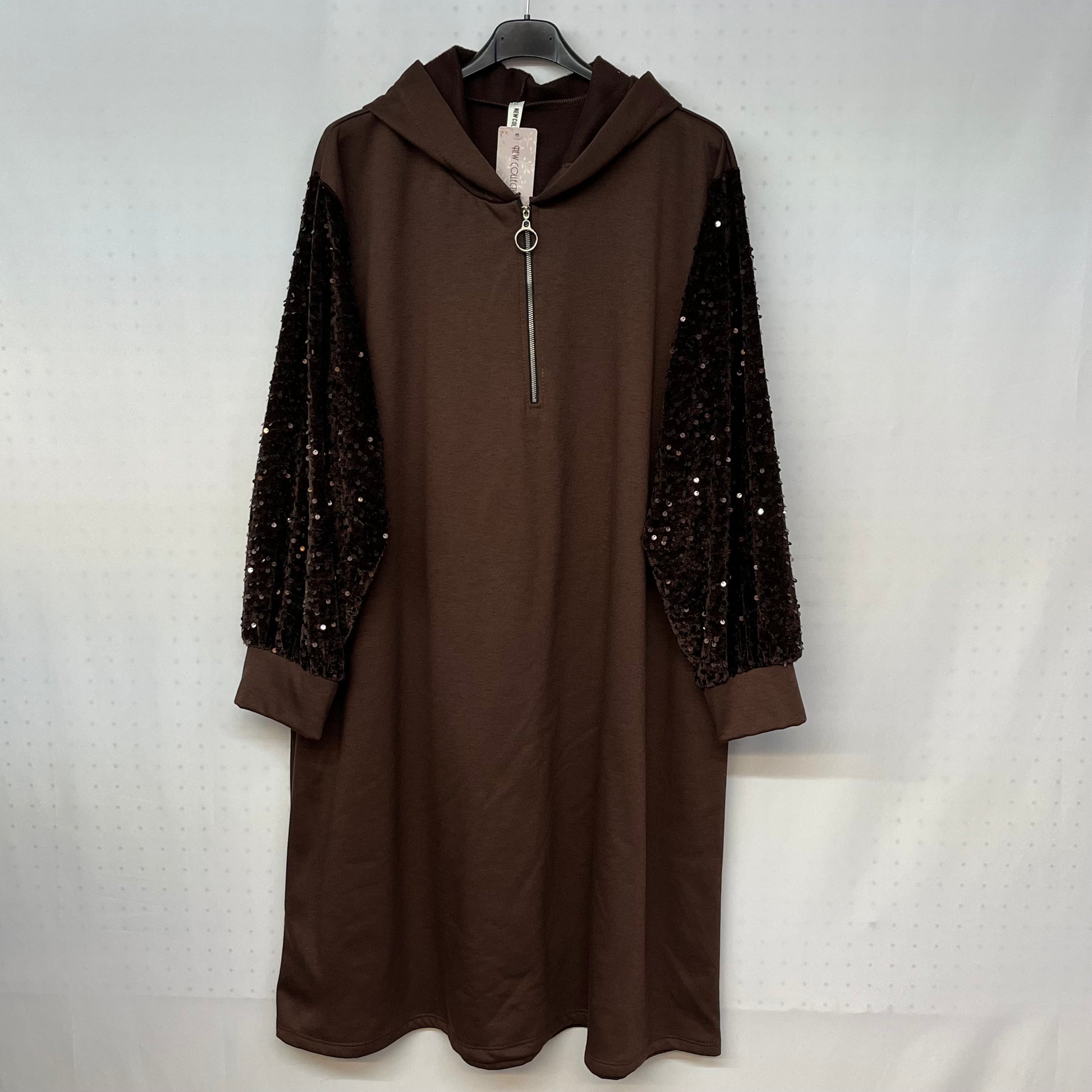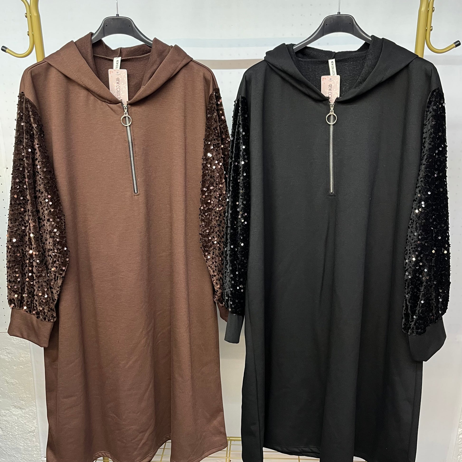 La Felpa lunga Felpone Lively offre un look elegante e divertente. Con il suo scollo metà zip e il cappuccio, questa felpa ti terrà al caldo e comoda in ogni occasione. Le maniche ricoperte di paillettes aggiungono un tocco di glamour al tuo outfit.