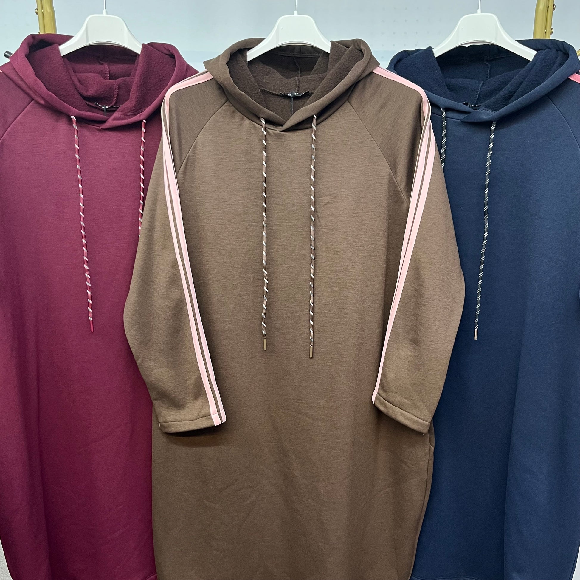 Bellissimo felpone lungo con cappuccio e laccetti, dalle maniche arricchite con due strisce rosa. Completamente felpato e con comode tasche, perfetto per le giornate più fredde. Scopri il mix di comfort e stile con il Felpone Pink Stripe.