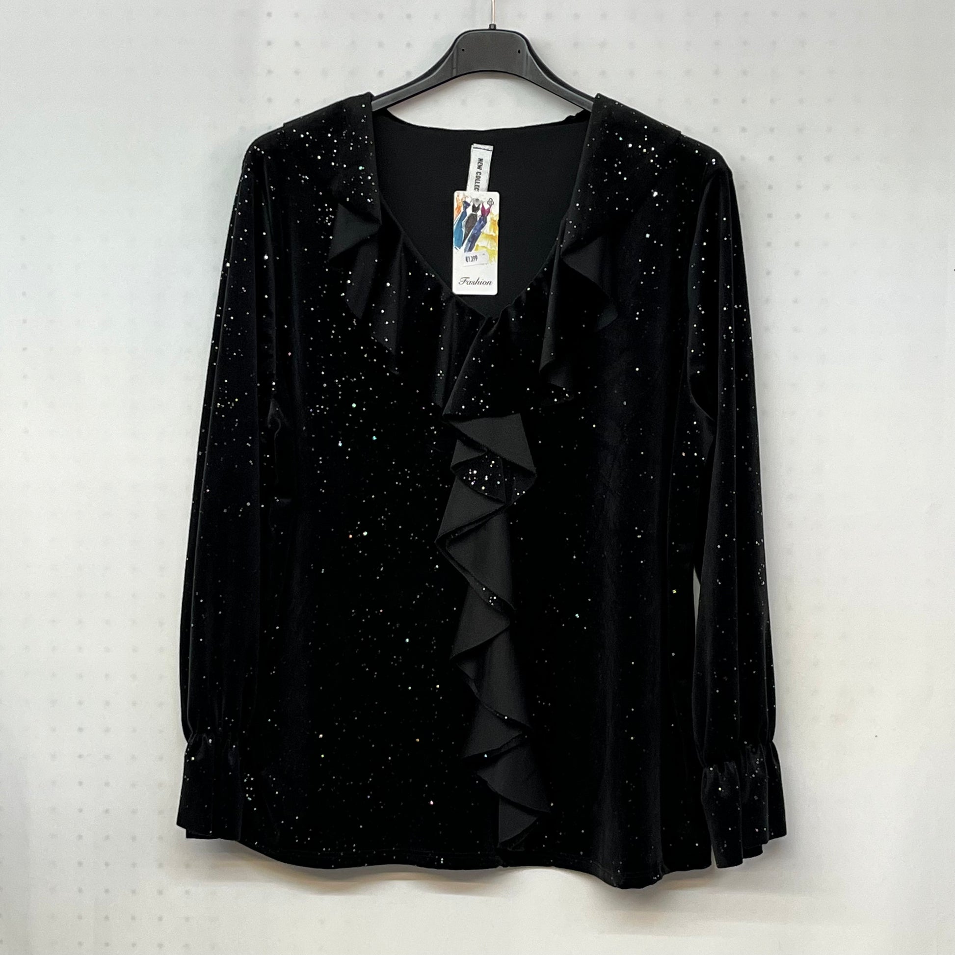 Questa maglia Midnight Stars è realizzata con un morbido tessuto di tipo vellutino e presenta uno scollo a V e un particolare volant. I glitter incorporati donano un tocco luccicante, perfetto per un look elegante e sofisticato. Aggiungi un tocco di glamour ai tuoi outfit con questa maglia unica.