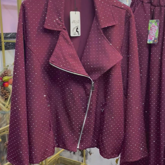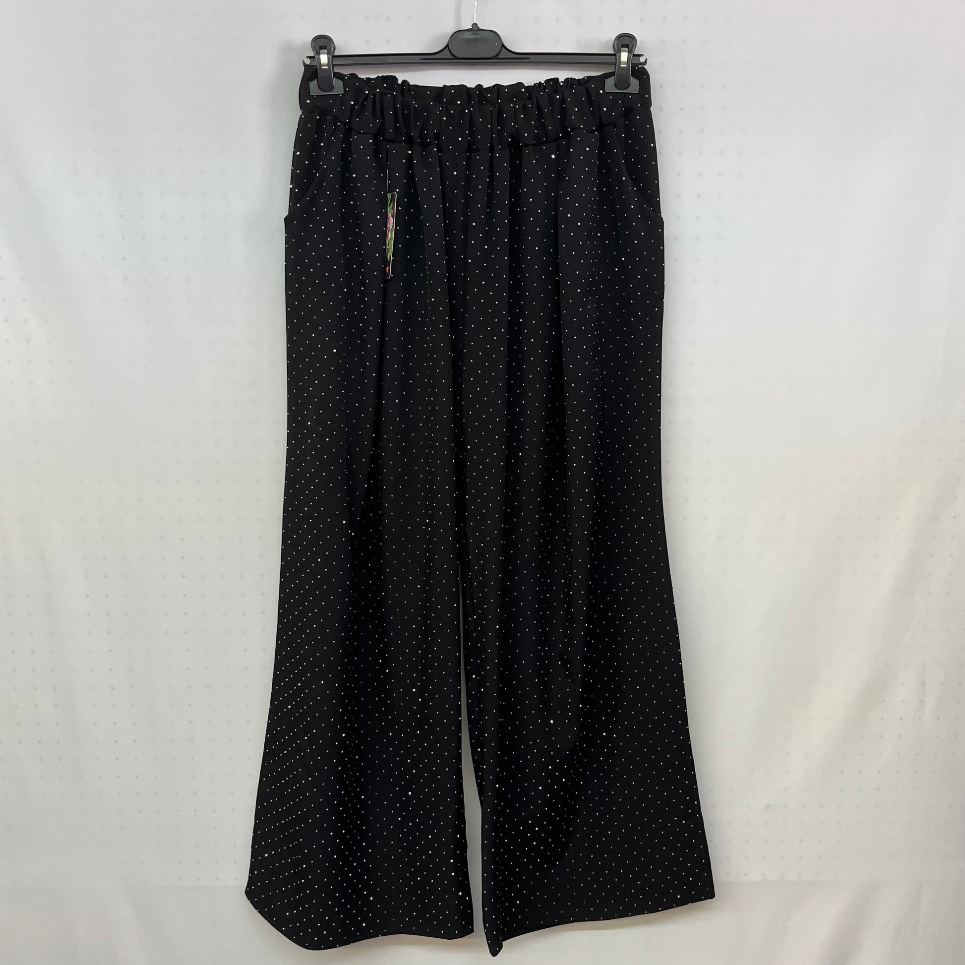 Esibisci la tua eleganza con il Pantalone Shine! Realizzato in tessuto elasticizzato, garantisce una comoda vestibilità e una perfetta aderenza in vita. Il tocco di brillantini aggiunge un elemento unico e prezioso al tuo outfit, per un look straordinario in ogni occasione.