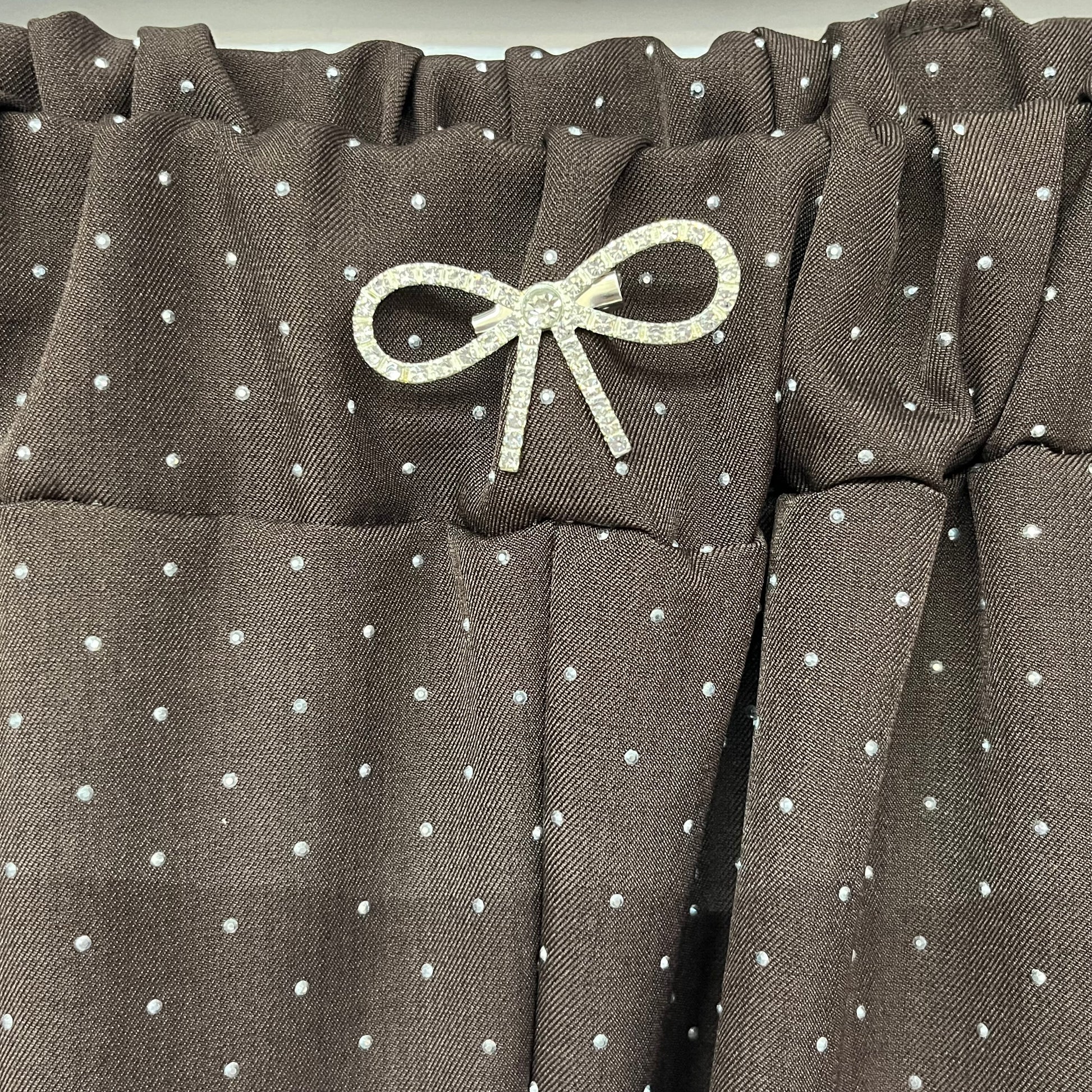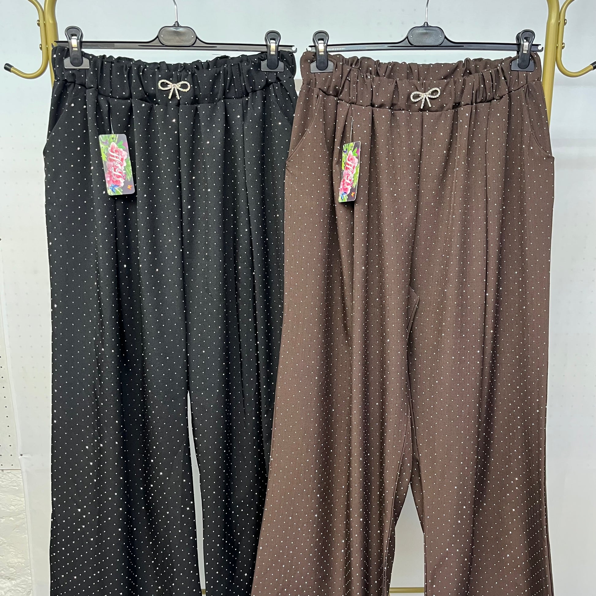 Pantalone a palazzo con tasche laterali e vita elasticizzata. Con brillantini applicati e una spilla luccicosa a forma di fiocchetto, rendendo questo pantalone elegante e pratico per qualsiasi occasione. Aggiungi un tocco di scintillio al tuo look con il Pantalone Shine Bow!