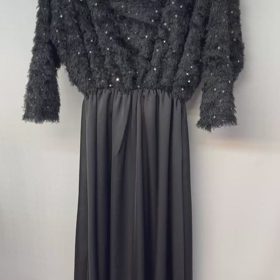 Questo vestito Royal è una combinazione perfetta di morbido tessuto peloso con paillettes e raso elasticizzato nella gonna. Con la sua eleganza e particolarità, ti farà sentire come una vera principessa e sarà perfetto per qualsiasi occasione speciale. Lascia che il tuo stile regali l'attenzione che merita con questo vestito lungo super elegante.