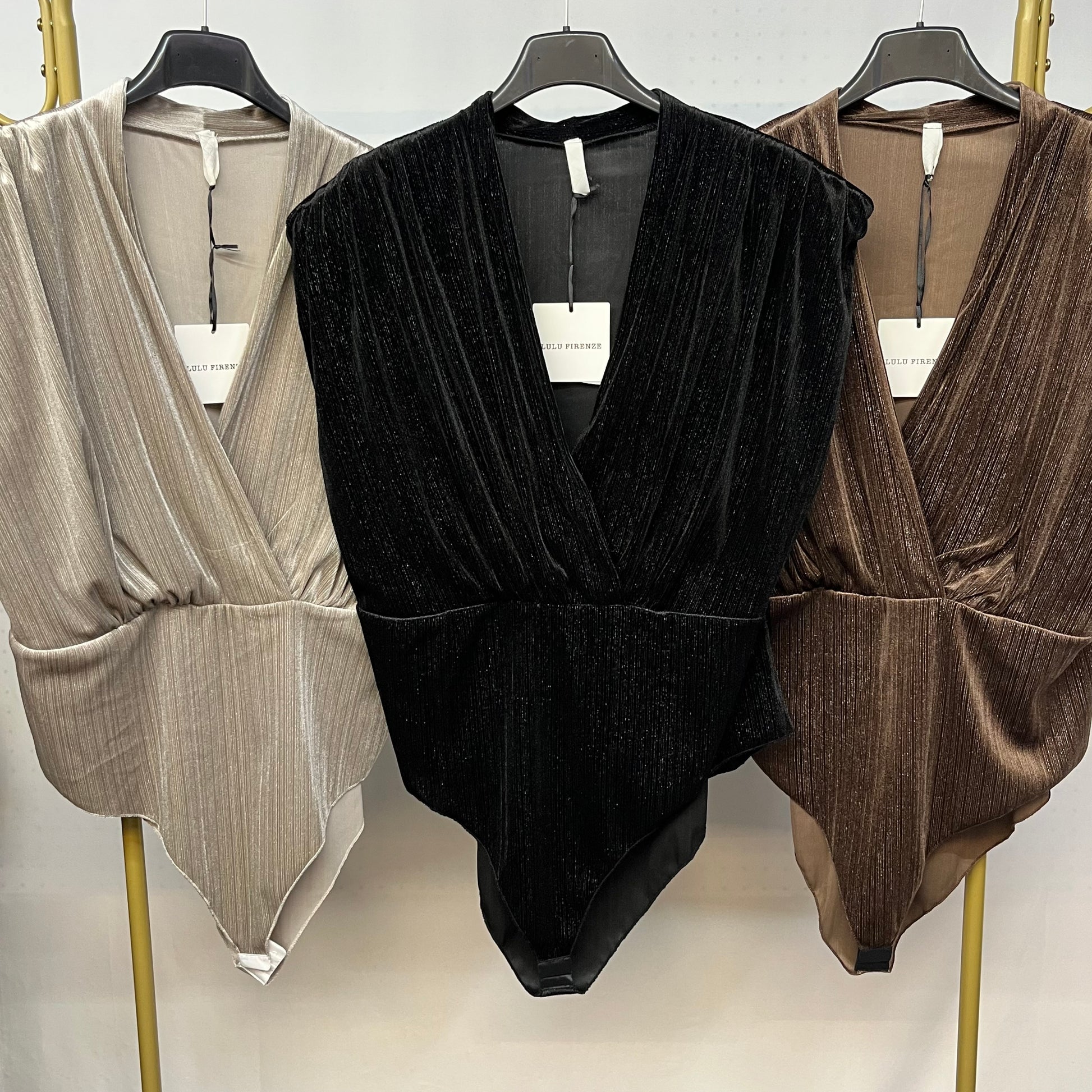Eleva la tua bellezza con il Body Shinmer con scollo a V. Una sensazione soffice come il velluto grazie al tessuto di questo capo. Le spalline garantiscono un perfetto fit e il filo brillantinato applicato su tutto il tessuto aggiunge un tocco scintillante al tuo look.