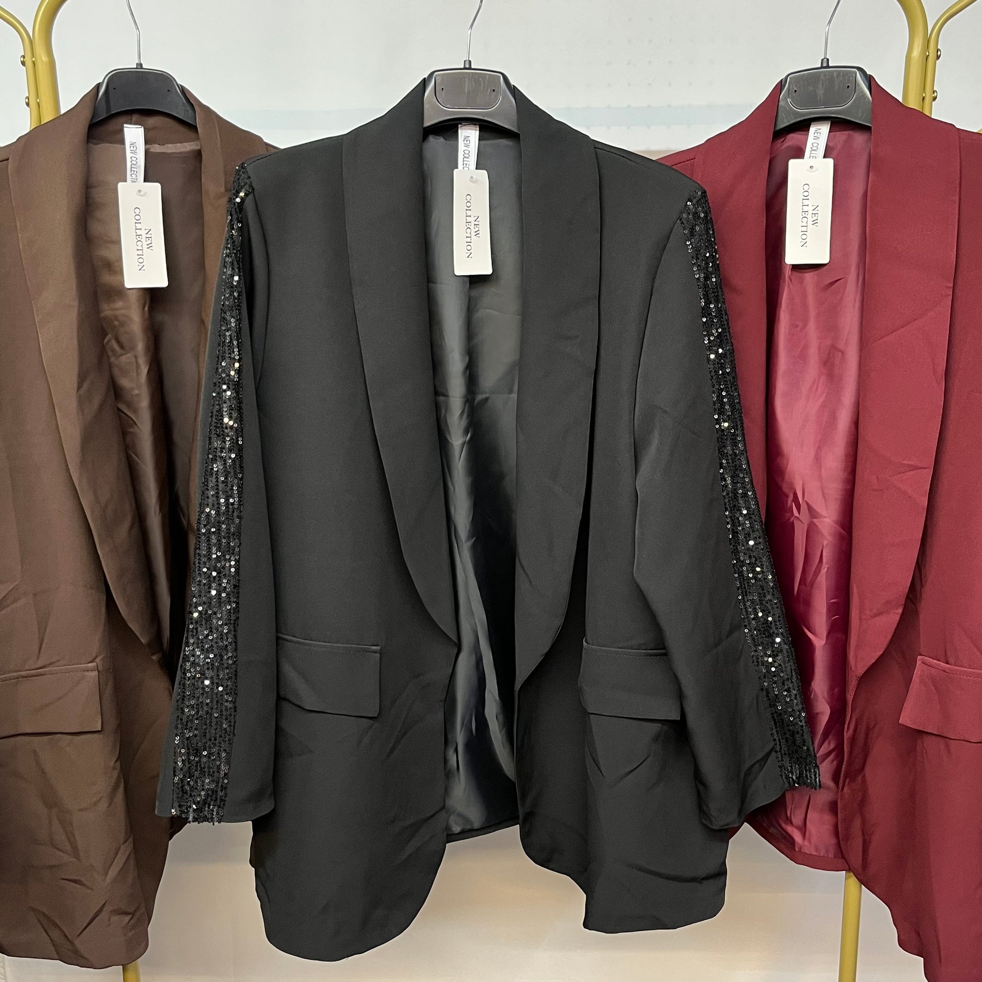 La Giacca High Fashion è una scelta di moda sofisticata che non passa inosservata. Realizzata con una fodera interna e spalline, offre un look elegante e raffinato. La banda di paillettes sui lati delle maniche aggiunge un tocco di luccichio.